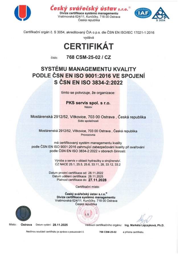 Certifikát systému managementu kvality dle požadavků podle ČSN EN ISO9001:2016 zahrnující zabezpečování kvality při svařování podle ČSN EN ISO 3834-2:2022